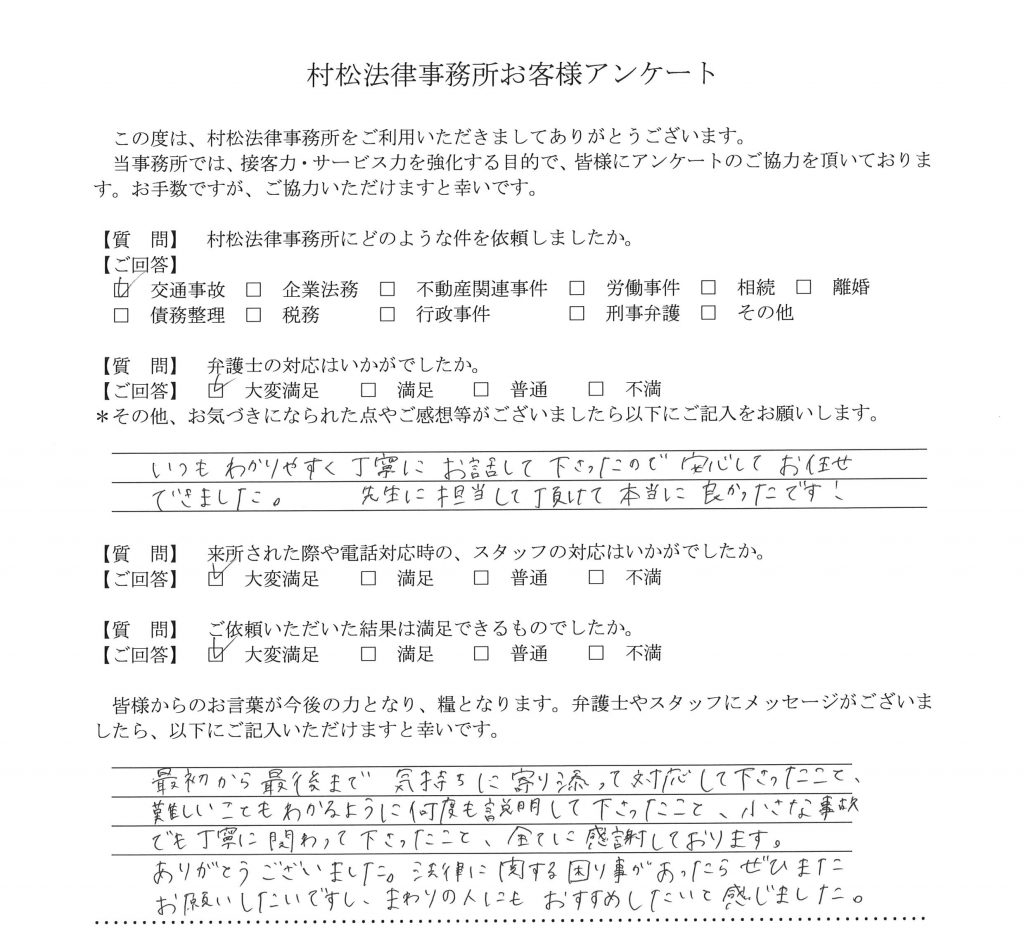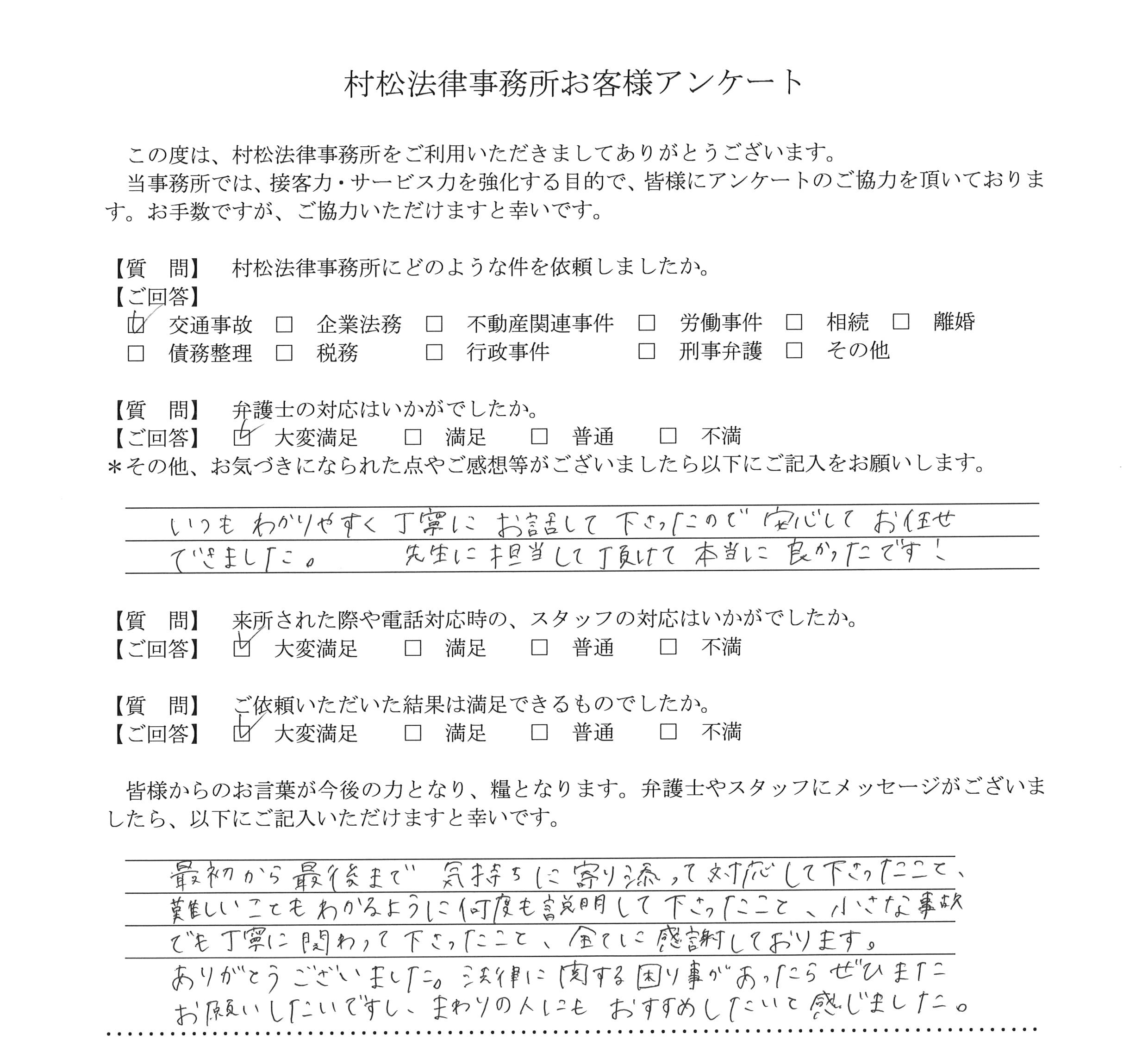 TOP お客様の声 お客様の声(156) 30代女性 | 北海道札幌市の弁護士による交通事故相談 お客様の声(156) 30代女性 2025年12月19日 最初から最後まで気持ちに寄り添って対応して下さったこと、 難しいこともわかるように何度も説明して下さったこと、 小さな事故でも丁寧に関わってくださったこと、全てにおいて感謝しております。 PREV お客様の声(155) 50代女性 NEXT